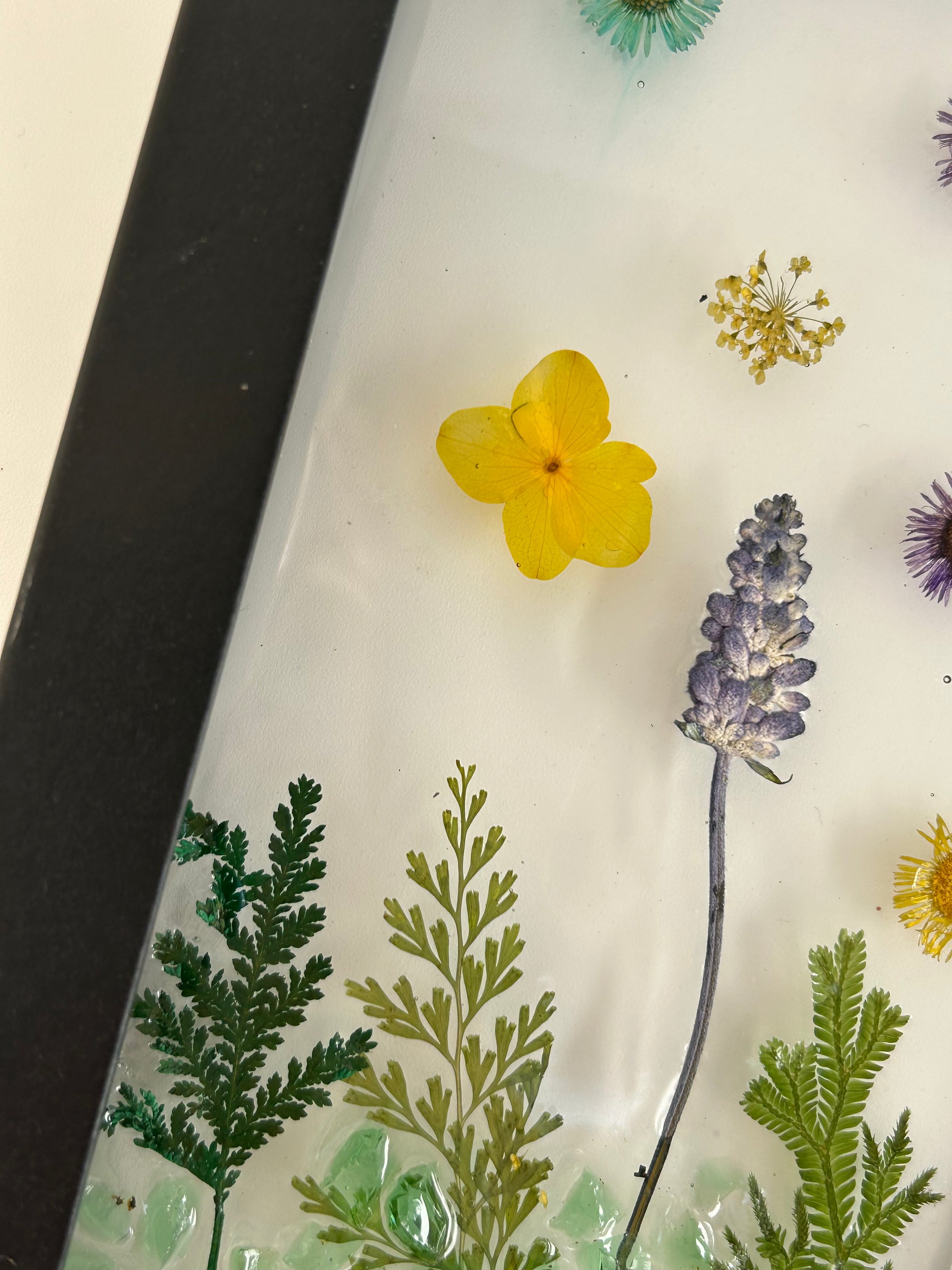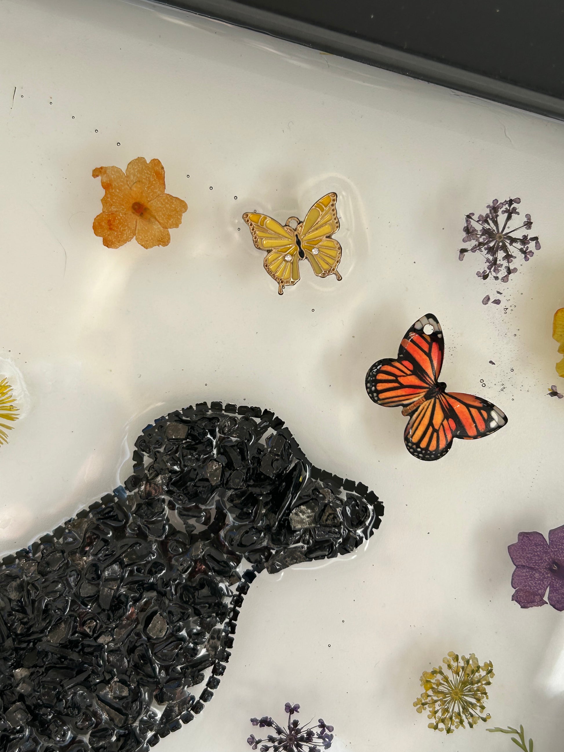- A charming dog silhouette enhanced with crushed glass, sparkling rhinestones, dried pressed flowers, and delightful butterfly charms.