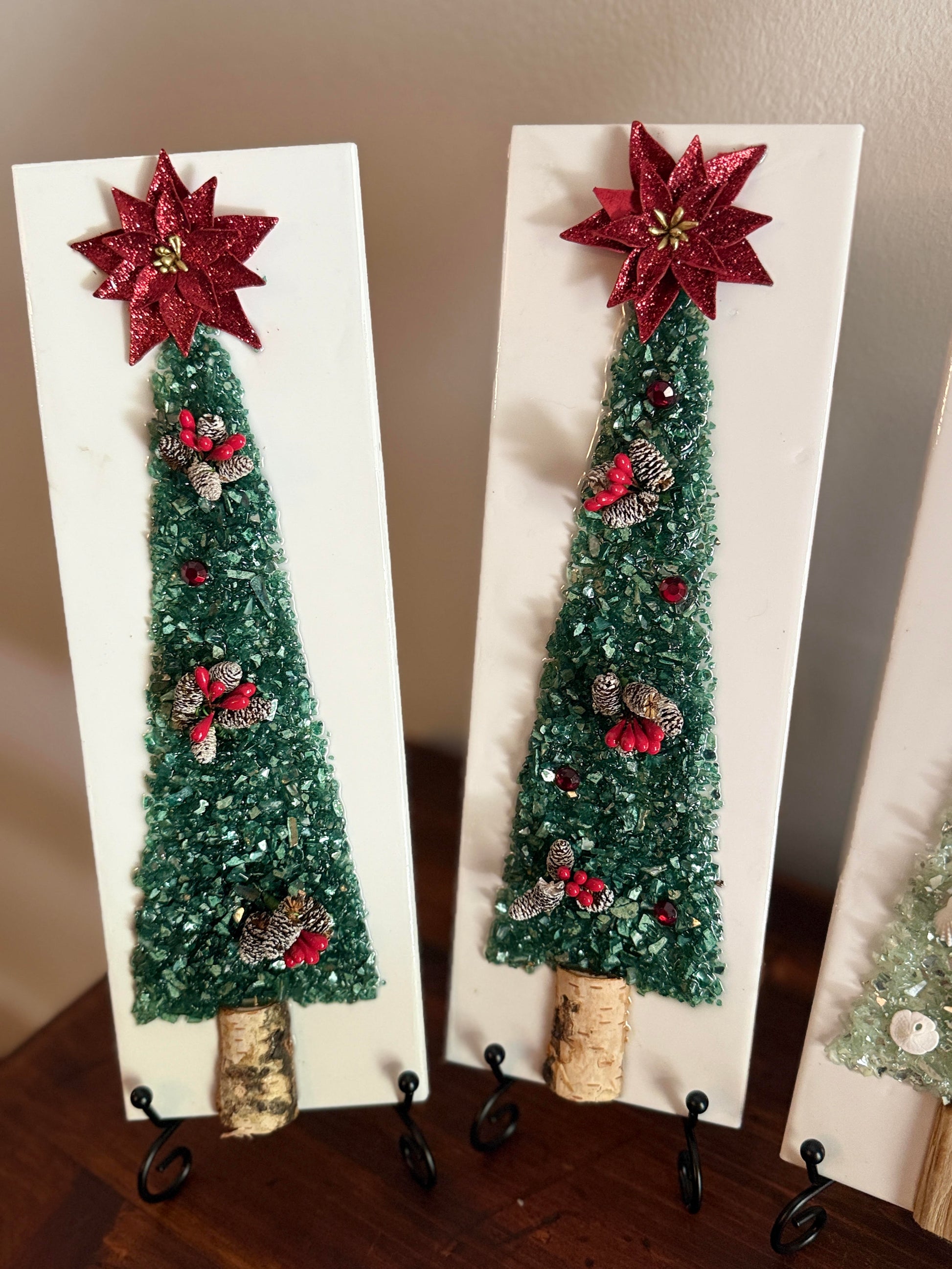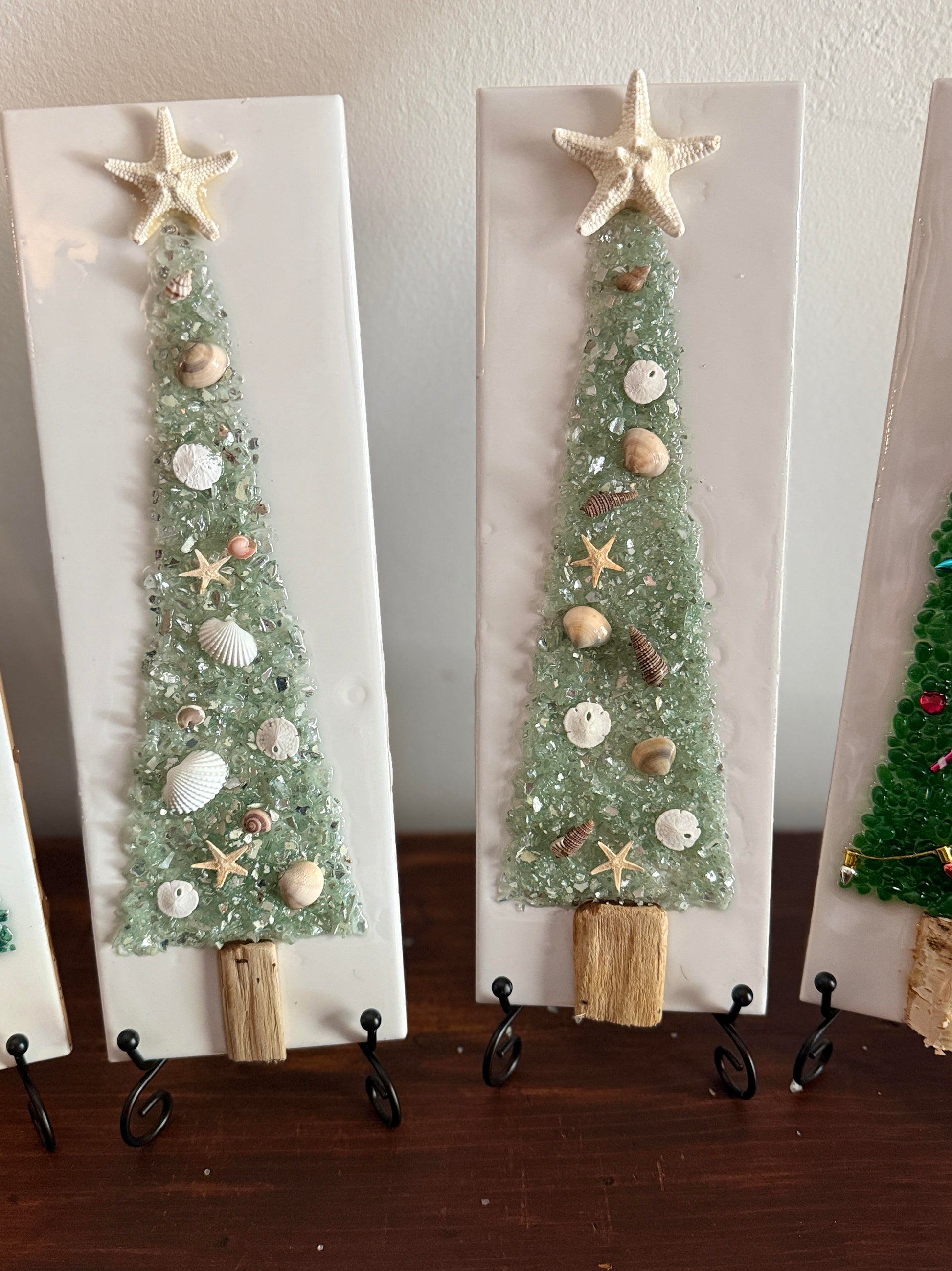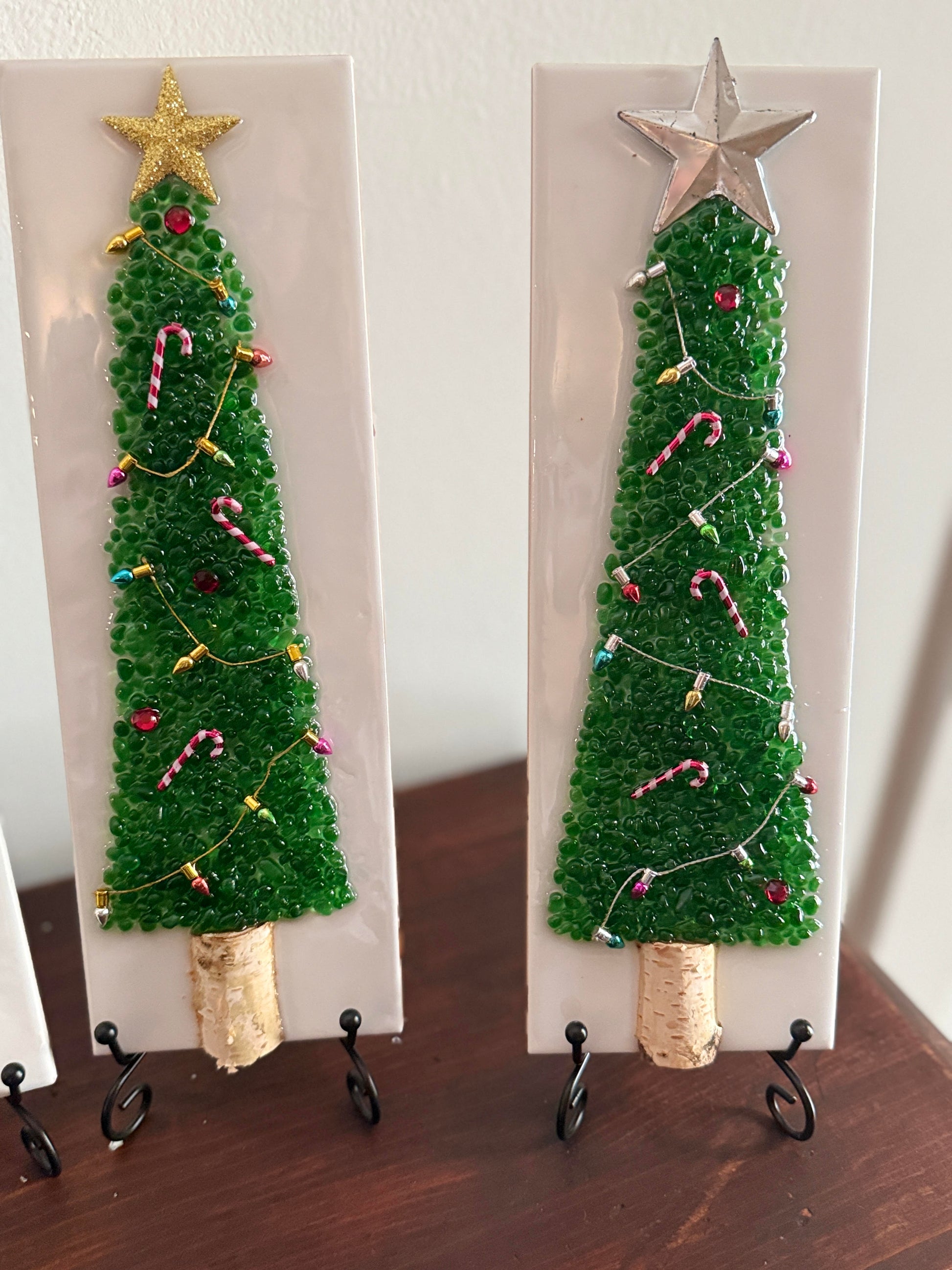 Create two beautiful Christmas trees on 3" x 12" tiles using sparkling crushed glass and epoxy.