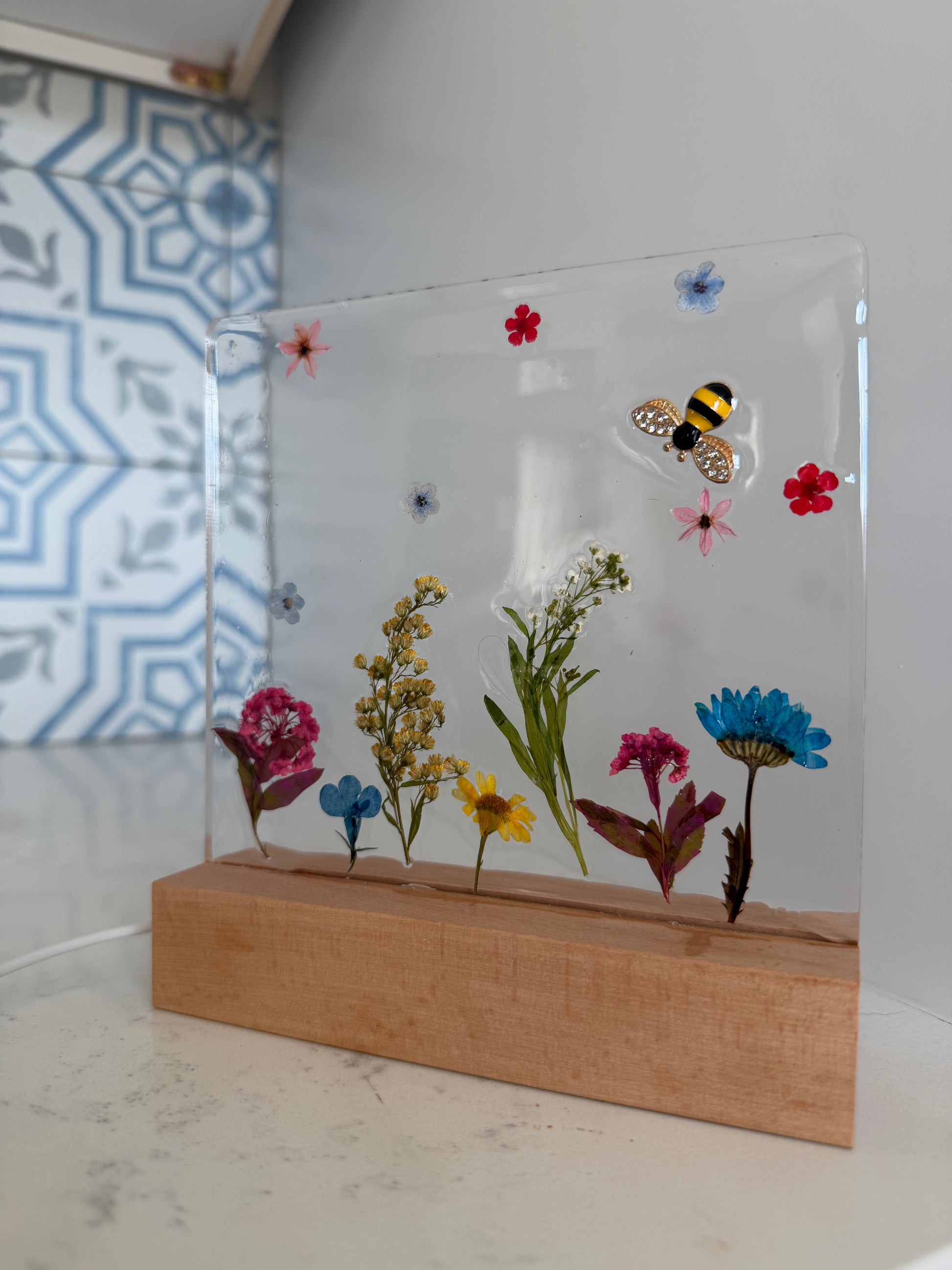 Your square design is set inside a wooden LED frame, casting a beautiful, soft glow once complete. We’ll be working with UV resin, so your piece will be fully cured and dry by the time you leave.